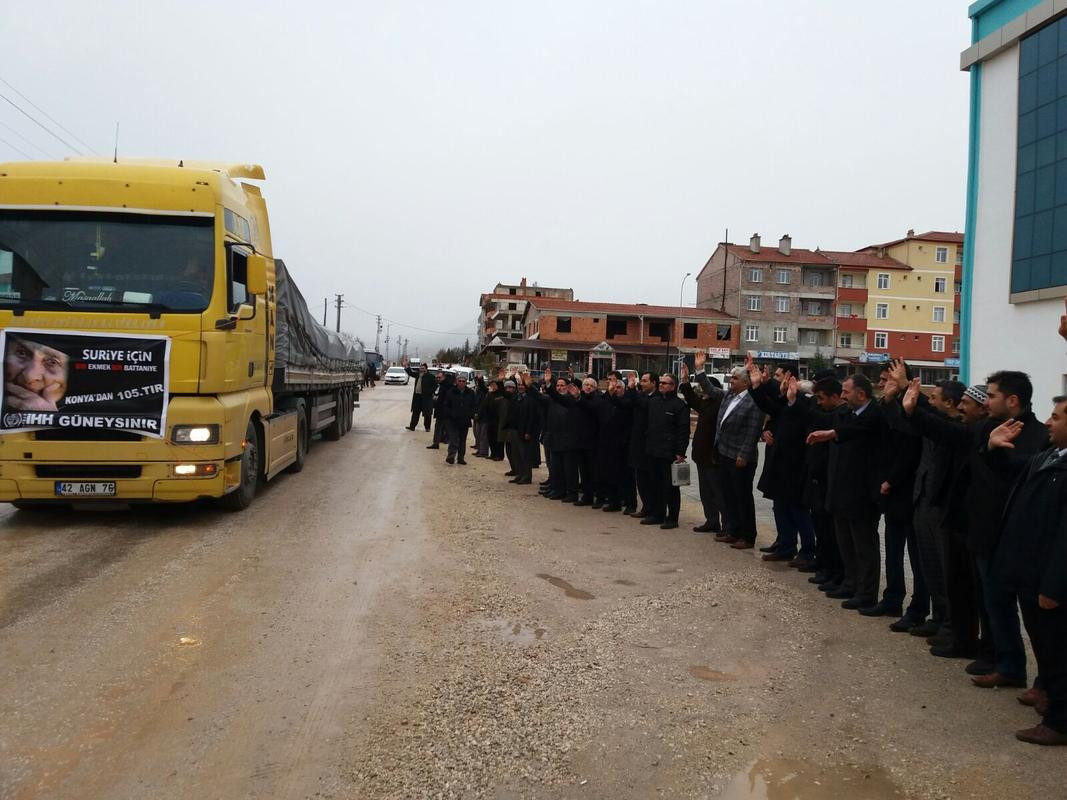 KONYA (AA) - Konya'nın Güneysınır ilçesinde kaymakamlık ve belediye aracılığıyla toplanan 3 tır yardım malzemesi, İnsan Hak ve Hürriyetleri (İHH) İnsani Yardım Vakfı aracılığıyla Bayırbucak Türkmenlerine ulaştırılmak üzere dualarla uğurlandı.