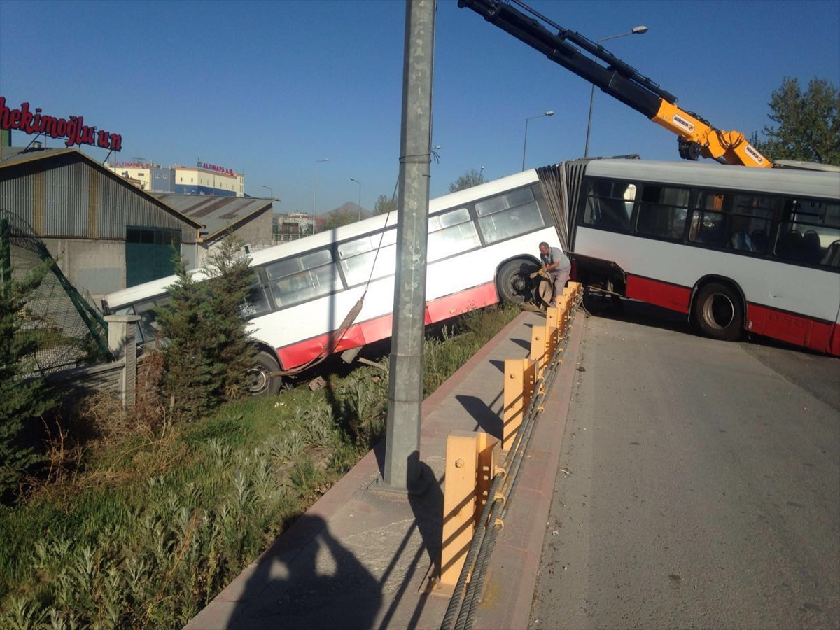 Konya'da kontrolden çıkan otobüs, köprü korkuluklarında asılı kaldı. Otobüsün içinde yolcu olmaması olası bir felaketi engelledi. Konya Büyükşehir Belediyesine ait şehir içi yolcu taşımacılığı yapan, sürücüsü henüz belirlenemeyen 42 BZ 937 plakalı otobüs, merkez Karatay ilçesi Ticaret Borsası Kavşağı yakınlarında, sürücünün direksiyon hakimiyetini kaybetmesi sonucu köprü korkuluklarına çarptı. Korkuluklarda asılı kalan otobüsün şoförü, çevredekilerin de yardımıyla araçtan çıkartıldı. İçinde yolcu bulunmayan otobüs, çekici yardımıyla köprü korkuluklarından indirildi. Kaza nedeniyle kısa süre aksayan ulaşım, otobüsün kaldırılmasının ardından normale döndü.