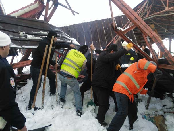 Bazı esnaf ve alışveriş için pazara gelen vatandaş, çatının metal parçaları ile düşen karların altında kaldı. İhbar üzerine olay yerine çok sayıda ambulans ve itfaiye ekibi sevk edildi. Enkaz altında kalanların kurtarılması için çalışmalar sürüyor.