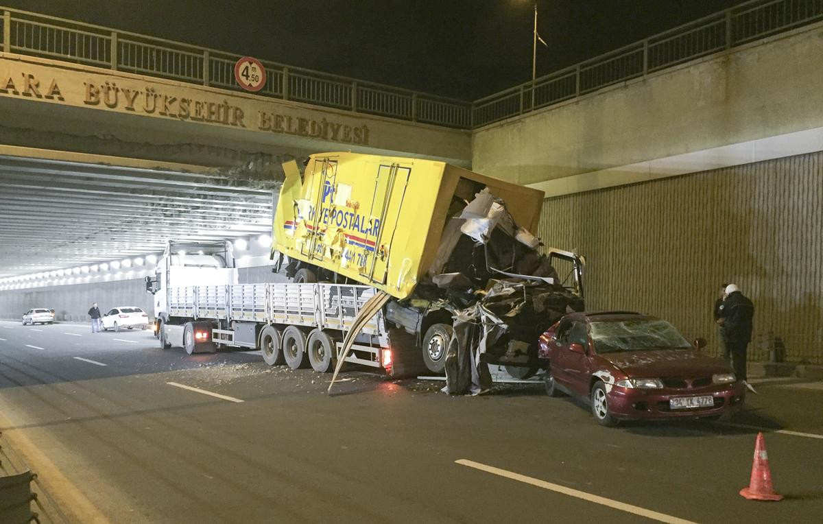 Alınan bilgiye göre, Sabri G. idaresindeki 21 BC 491 plakalı Sivas'tan Ankara ve İstanbul'a hasarlı araç götüren tırın kasasındaki bir kamyon, Turgut Özal Bulvarı Bostancık Caddesi kavşağında köprüye takıldı.