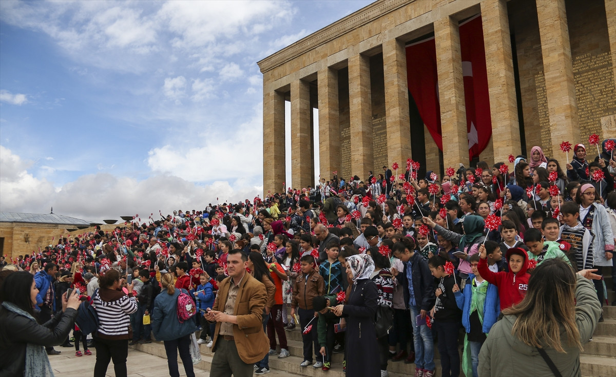 Devlet Tiyatroları Genel Müdürü Nejat Birecik ve çocuklar, Aslanlı Yol'dan yürüyerek, Atatürk'ün mozolesine geldi. Birecik'in, mozoleye çelenk bırakmasının ardından saygı duruşunda bulunuldu.