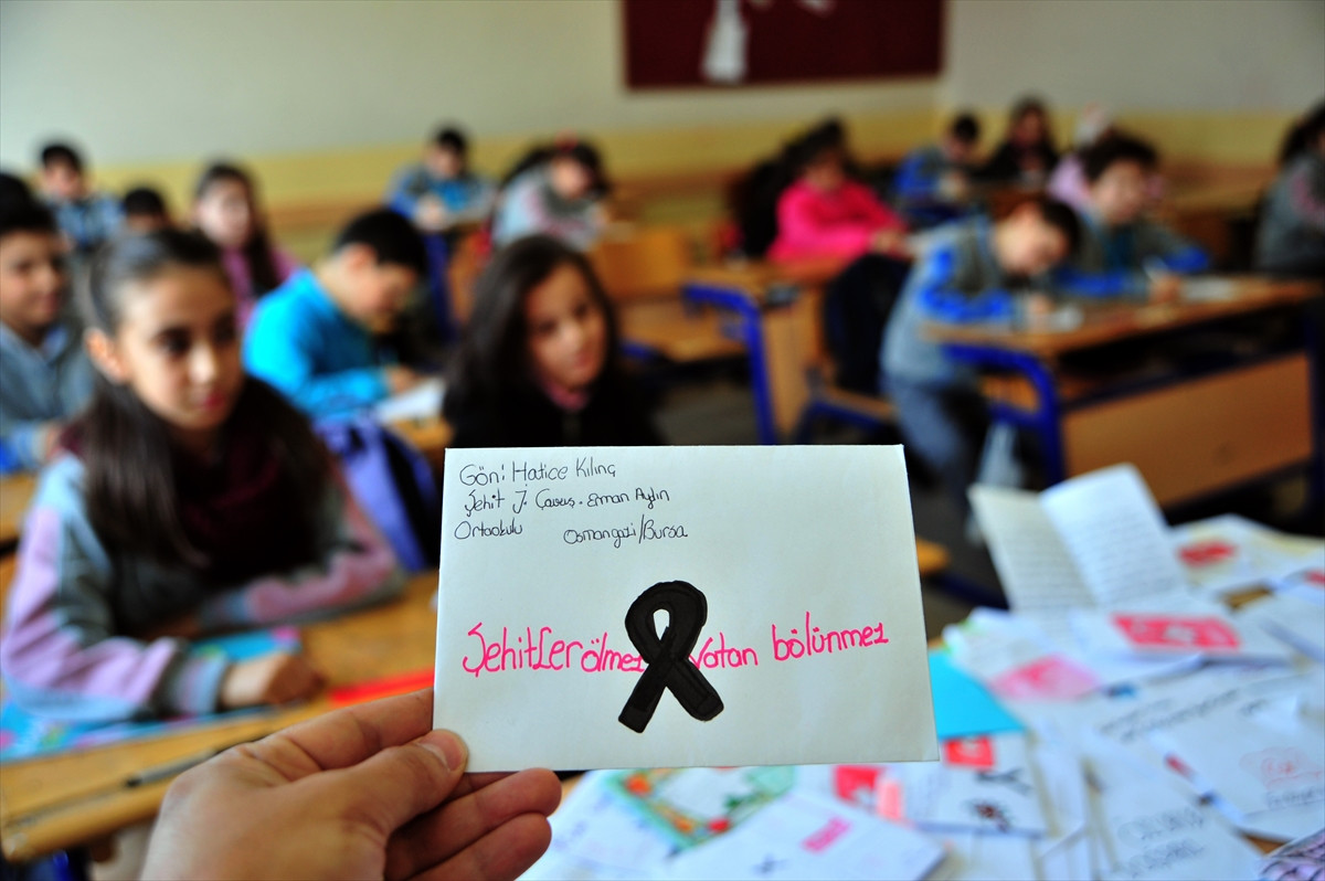 BURSA (AA) - Bursa'da bir ortaokulun öğrencileri, okula adı verilen Erman Aydın'ın şehit düştüğü Tunceli'deki karakola, Fırat Kalkanı Harekatı kapsamında Suriye'de bulunan geçici birlikler ile yakın zamanda şehitler veren Kayseri'deki 1. Komando Tugayı'nda görevli askerlere moral vermek için harçlıklarını biriktirip aldıkları kestane şekeri ile mektup gönderdi.