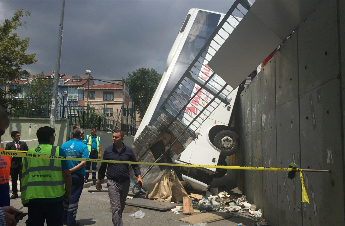 İSTANBUL (AA) - Küçükçekmece'de kontrolden çıkan servis otobüsü yol kenarındaki bazı araçlara çarparak bariyerlerden aşağı devrildi.