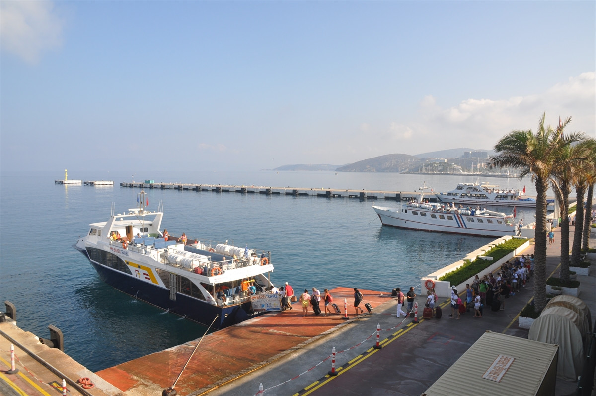 Kuşadası Ege Ports Limanı'ndan Yunan adalarına geçmek isteyen çok sayıda vatandaş bilet ve pasaport kontrol noktalarında uzun kuyruklar oluşturdu.