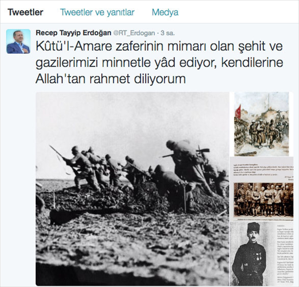 Erdoğan, sosyal paylaşım sitesi Twitter'daki hesabından Kut'ül Amare Zaferi'nin 100. yılı dolayısıyla mesaj yayımladı.