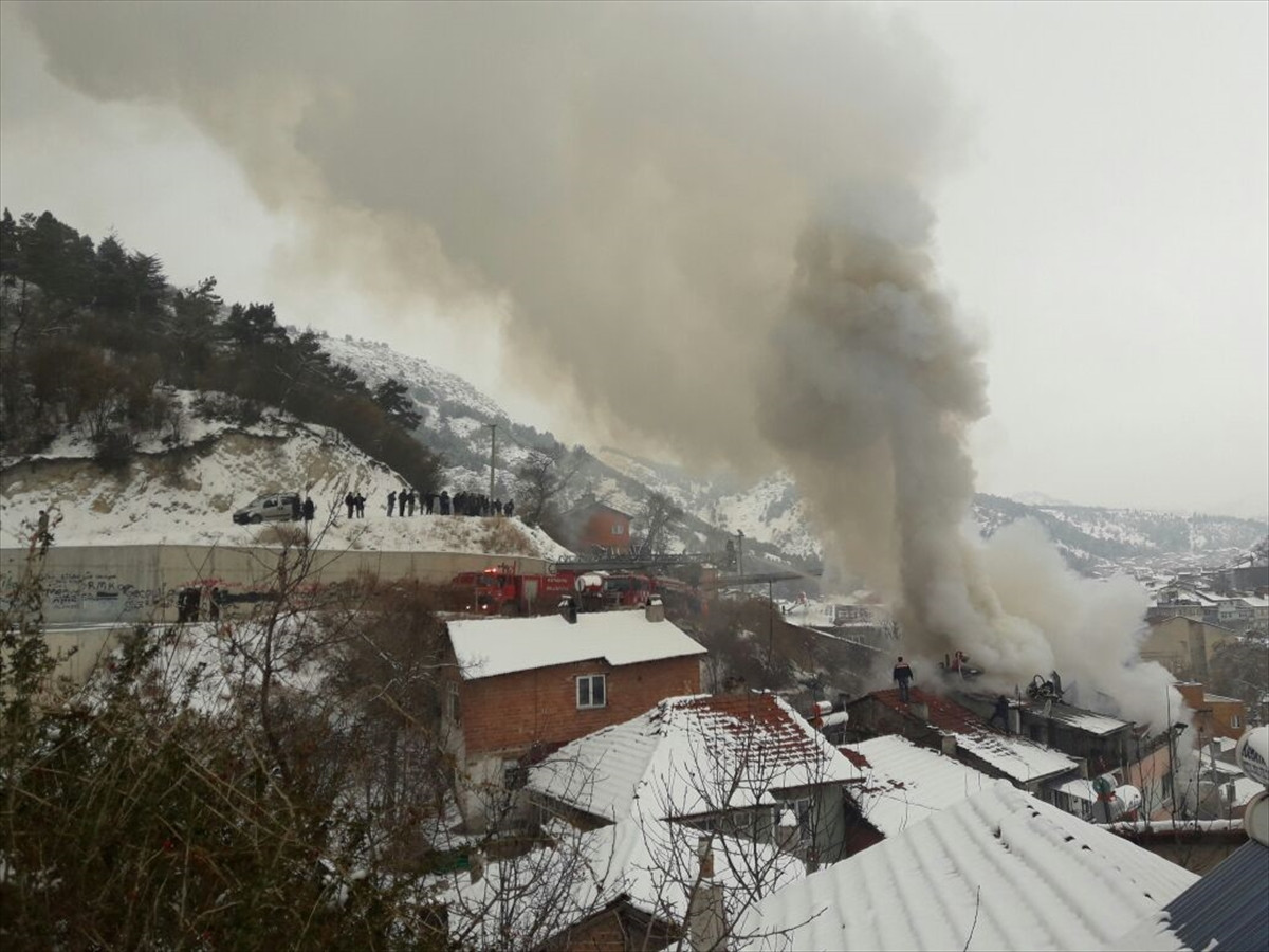 KÜTAHYA (AA) - Kütahya'da iki katlı ahşap binada çıkan, bitişikteki iki eve sıçrayan yangına itfaiye ekipleri müdahale ediyor.