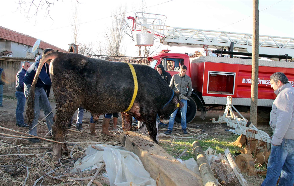 İneği kuşudan çıkaramayan vatandaşlar itfaiye ekiplerine haber verdi. Muğla Büyükşehir Belediyesinde görevli itfaiye erleri, kepçe yardımı ile kuyuya indi.