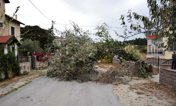 Bu arada, merkeze bağlı Çınarlı köyünde bir evin bahçesindeki iğde ile aynı bölgedeki bir çam ağacı fırtına nedeniyle devrildi. Yaklaşık 15 metre yüksekliğindeki iğde ağacı kök kısmından kırılarak yola devrildi.