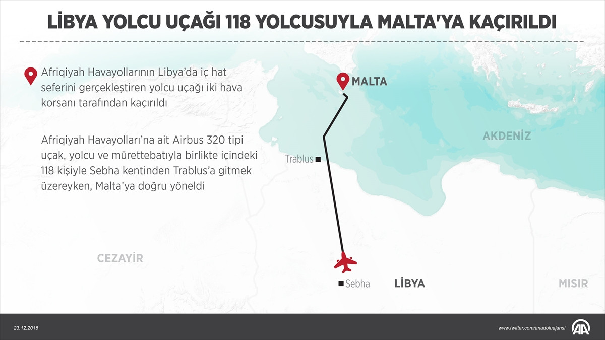 Libya'nın Sebha kentinden sabah yerel saatle 10.10'da Trablus'a gitmek üzere havalanan uçak, içindeki 111 yolcu ve 7 mürettebatla yerel saatle 11.32'de Malta'nın Luqa Havalimanı'na inmişti. Kaçırılan uçaktaki iki hava korsanının, uçağı patlatmakla tehdit ettiği belirtilmişti.