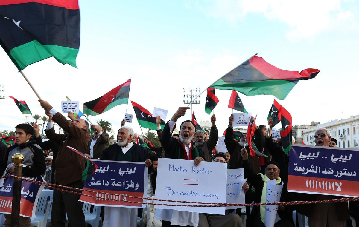 Başkent Trablus'un merkezinde toplanan yüzlerce gösterici, Libya Siyasi Antlaşması'nı ve oluşturulacak geniş tabanlı Ulusal Mutabakat Hükümeti’nin "Batı vesayeti kapsamında" oluşturulduğunu savunarak, buna karşı oldukları yönünde sloganlar attı.