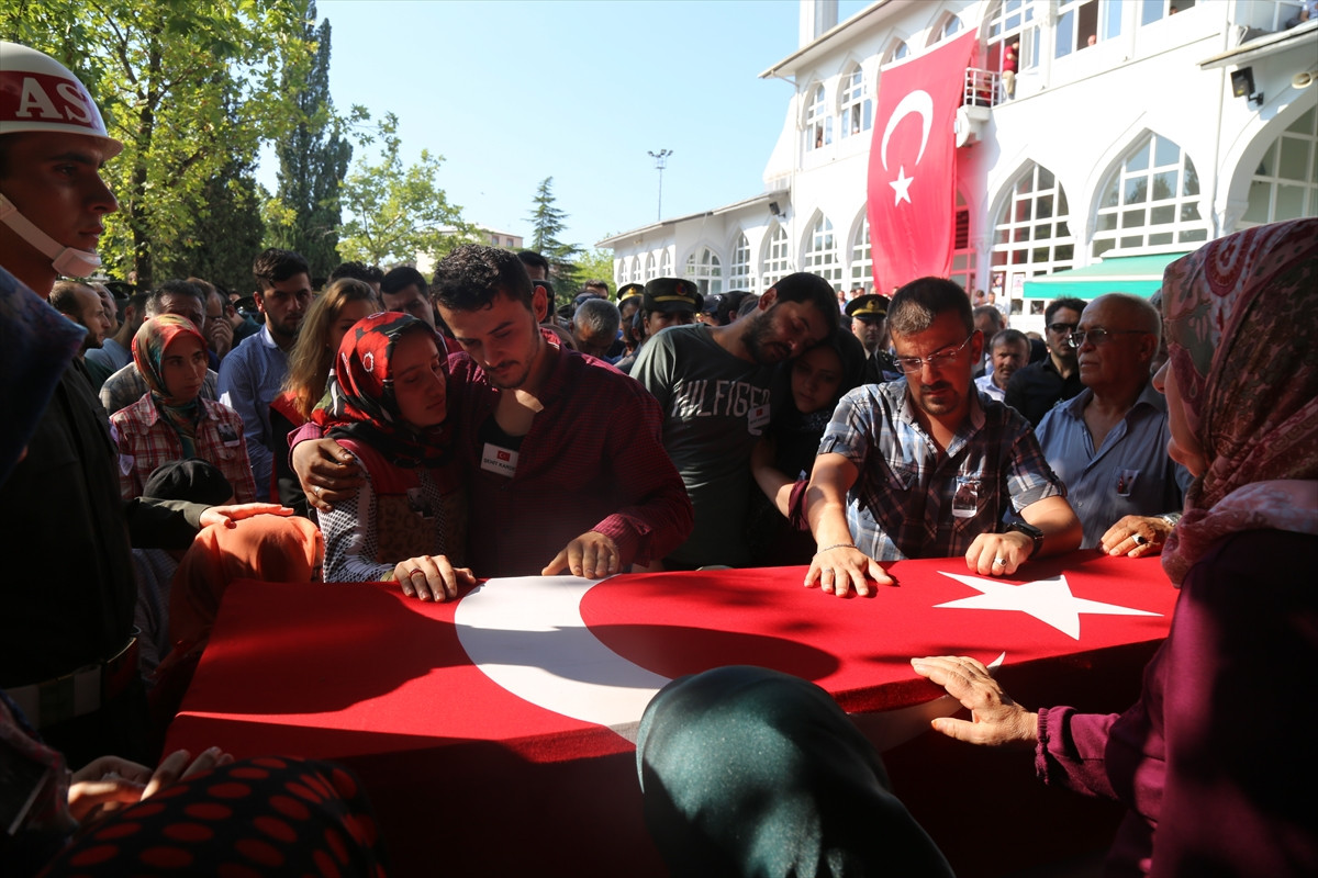 SAKARYA (AA) - Diyarbakır'ın Lice ilçesinde düzenlenen operasyonda, PKK'lı teröristlerin saldırısı sonucu şehit olan 24 yaşındaki Uzman Çavuş Yunus Aktaş'ın cenazesi, Sakarya'nın Akyazı ilçesinde defnedildi.Kocaeli Cengiz Topel Havalimanı'ndan alınan şehit Aktaş'ın naaşı, Akyazı ilçesi Konuralp Mahallesi'ndeki baba evine getirildi. Burada helallik alınmasının ardından şehidin cenazesi, Gazi Süleyman Paşa Camisi'ne götürüldü.Burada taziyeleri kabul eden şehidin yakınları, Aktaş'ın Türk bayrağı örtülü tabutuna sarılarak ağladı. Şehidin annesi Sevim Aktaş, nişanlısı Kübra Ateş, şehidin kardeşleri ile yakınları ayakta durmakta güçlük çekti, gözyaşlarını tutamadı. Bu arada cenazeye katılan milli motosikletçi Kenan Sofuoğlu da şehit yakınlarına başsağlığı diledi.