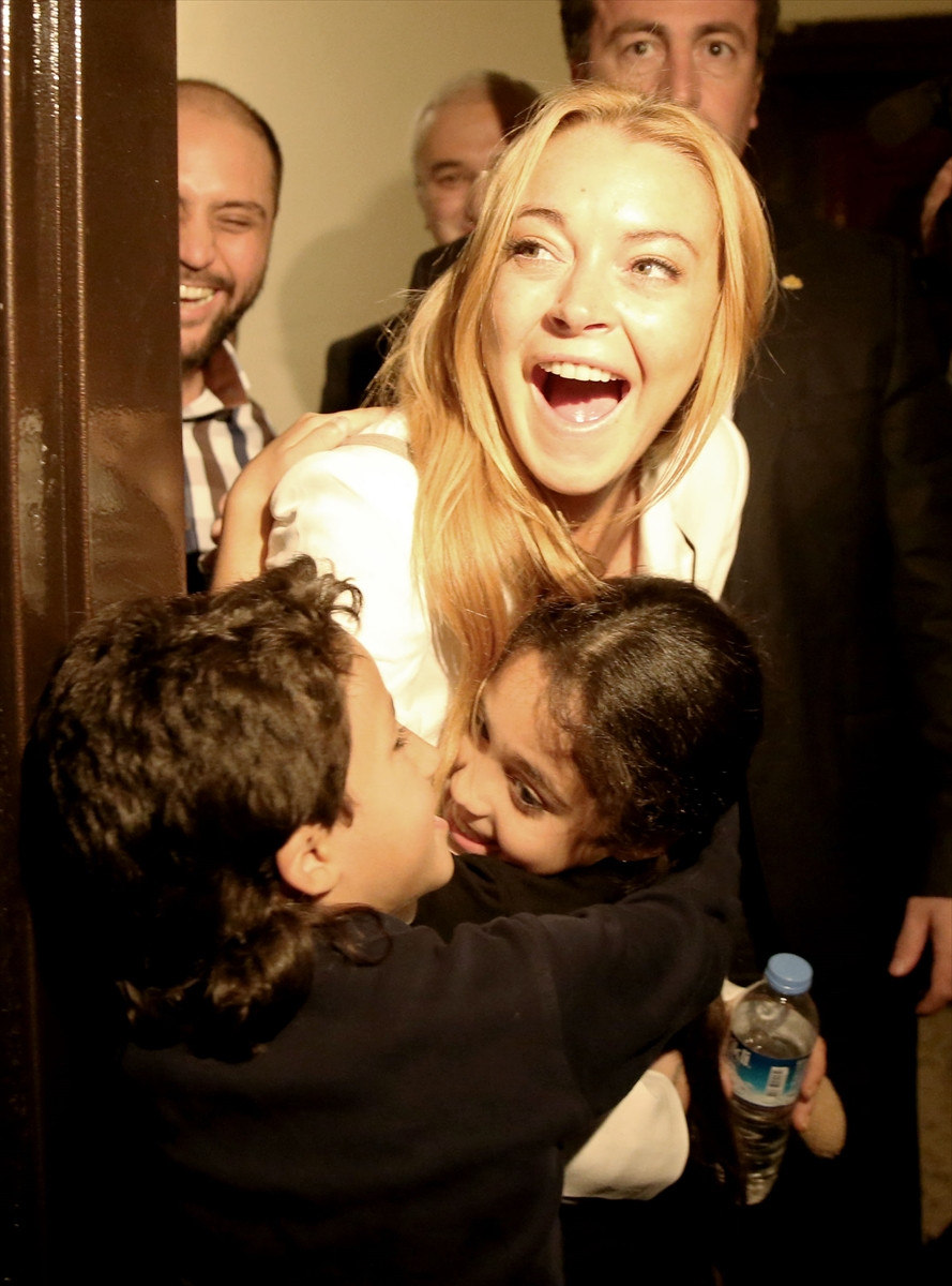 Ailenin küçük kızı Hela, Lohan'ı kapıda karşıladı. Lohan ve Hela sarılıp, kucaklaşarak hasret giderdi. Baba Muhammed Hüseyin ve çocuklarıyla uzun süre sohbet eden Lohan, çocuklara sık sık sarıldı ve onları öptü.
