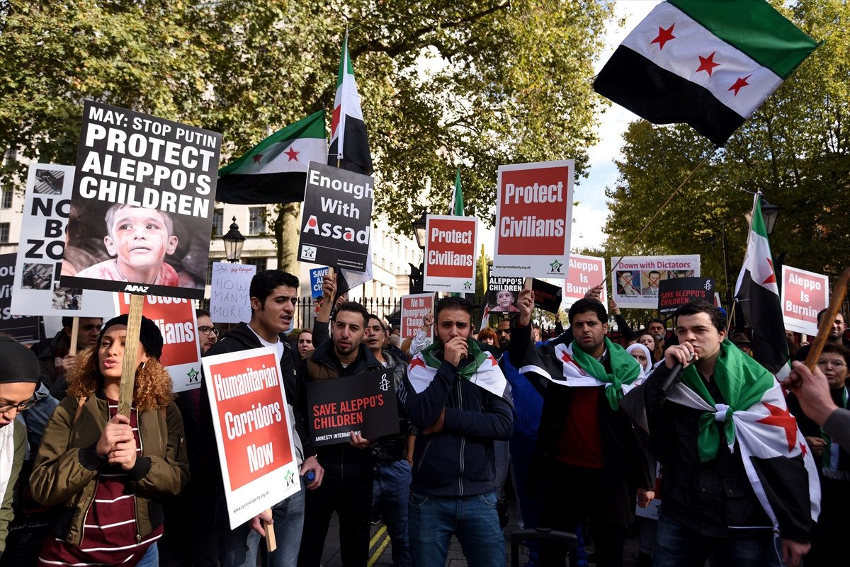 Suriye'nin kuzeyinde şiddetli saldırıların hedefi olan Halep'te gün geçtikçe derinleşen insani kriz, Londra’da Başbakanlık konutu önünde protesto edildi.
