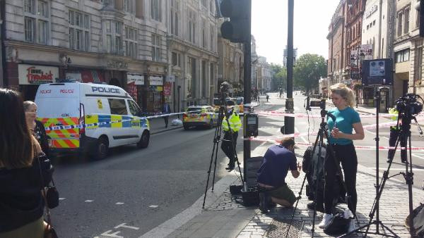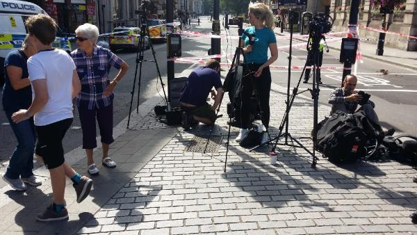 Basın mensupları ve olay yerine yaklaşmaya çalışan kişiler Terör Eylemi polis şeridi olarak da bilinen mavi şeritle çevrili alanın dışına çıkartıldı.