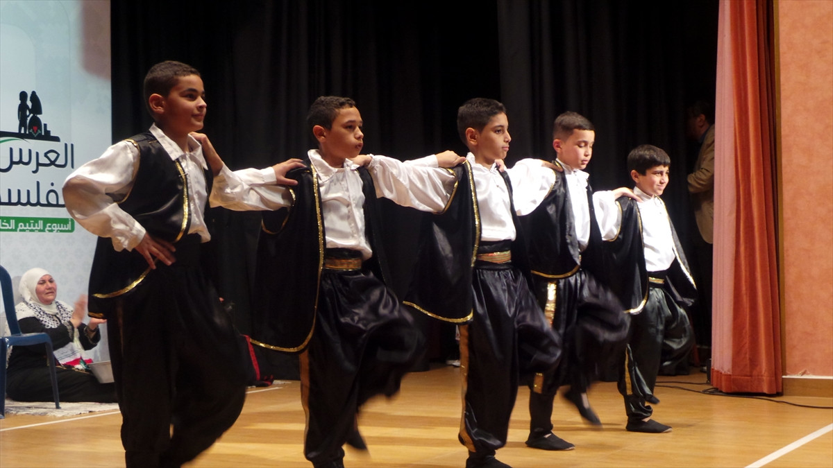 Sahneye çıkan 6 ile 12 yaş arası Filistinli yetim çocuklar, Filistin müziği eşliğinde yöresel oyunları oynadı. Damat ve gelini canlandıran Filistinli yetimlerin etrafında yöresel oyunları oynayan miniklere izleyiciler de alkış ve zılgıt çekerek eşlik etti.