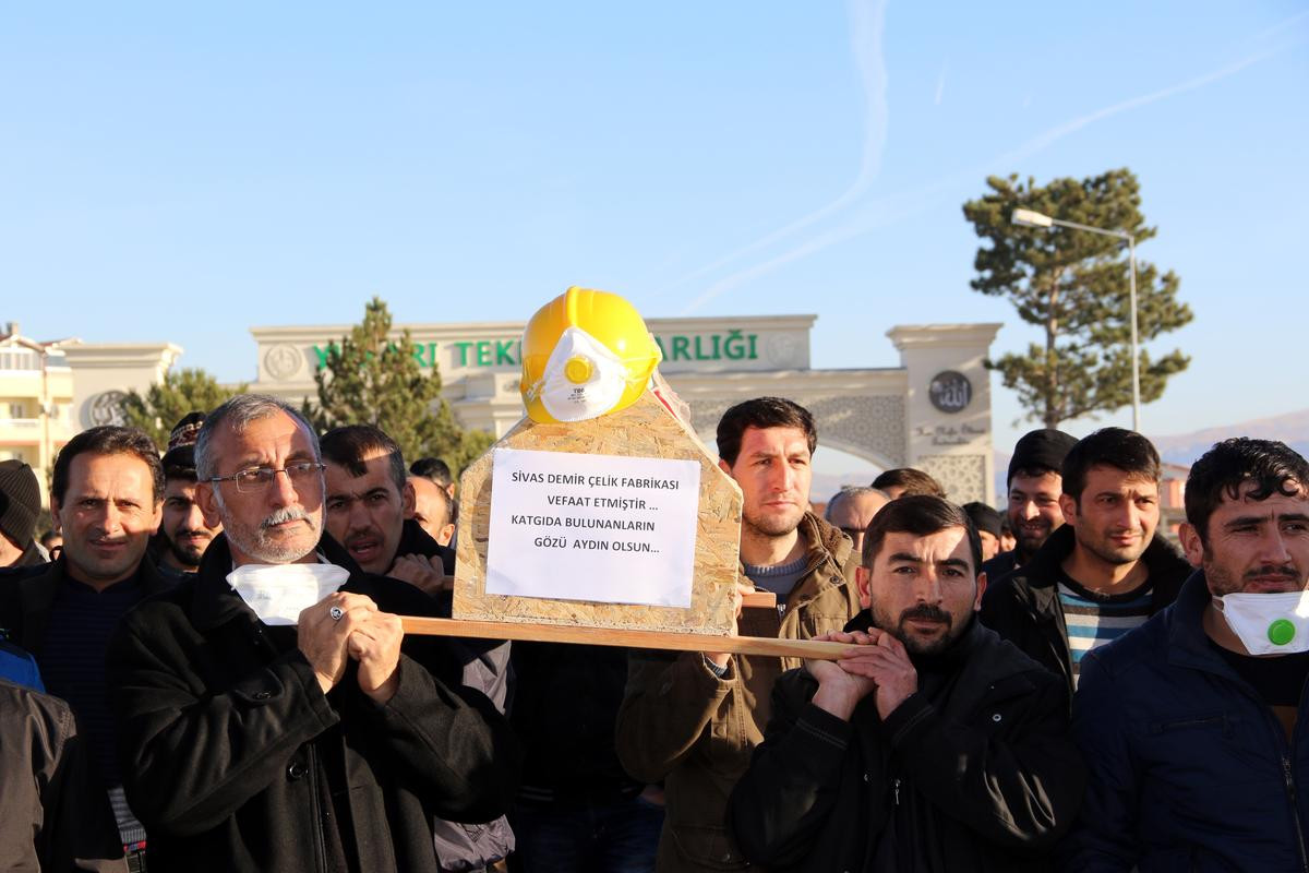İşçiler, Cumhuriyet Meydanı'na omuzlarında taşıdıkları ve üzerinde "Sivas Demir Çelik Fabrikası vefat etmiştir, katkıda bulunanların gözü aydın" yazan, Türk bayrağına sarılı tabutla geldi. İşçiler, temsili cenaze namazı da kılarak, görevleri başında hayatını kaybeden mesai arkadaşları için saygı duruşunda bulundu.