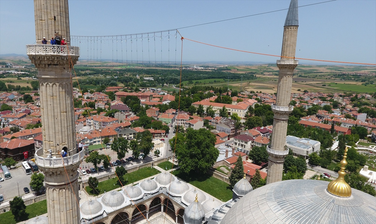 EDİRNE (AA) - Ramazan ayının gelişiyle birlikte, Osmanlı Padişahlarının yaptırdığı ve Selatin Camileri olarak bilinen tarihi camilerin minareleri arasına yazılan mahyalar, sıcak havalarda ustalarını daha çok zorluyor.