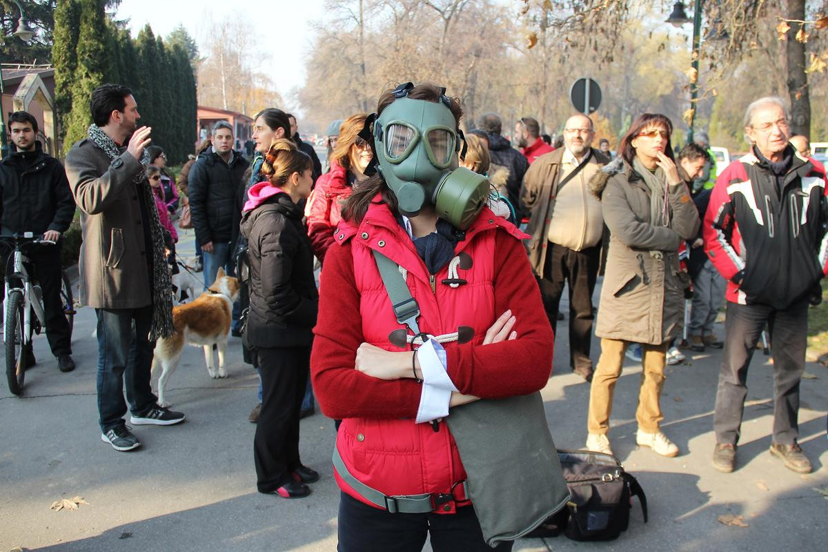 Üsküp Büyükşehir Binası önünde toplanan kalabalık, hava kirliliğine neden olan otomobil lastiklerinden yağ elde edilmemesi, sanayi sitelerinin filtrelenmesi ve ağaçların kesilmemesi noktalarında çağrıda bulunarak, "Nefes alınamıyor" yazılı dövizler açtı.