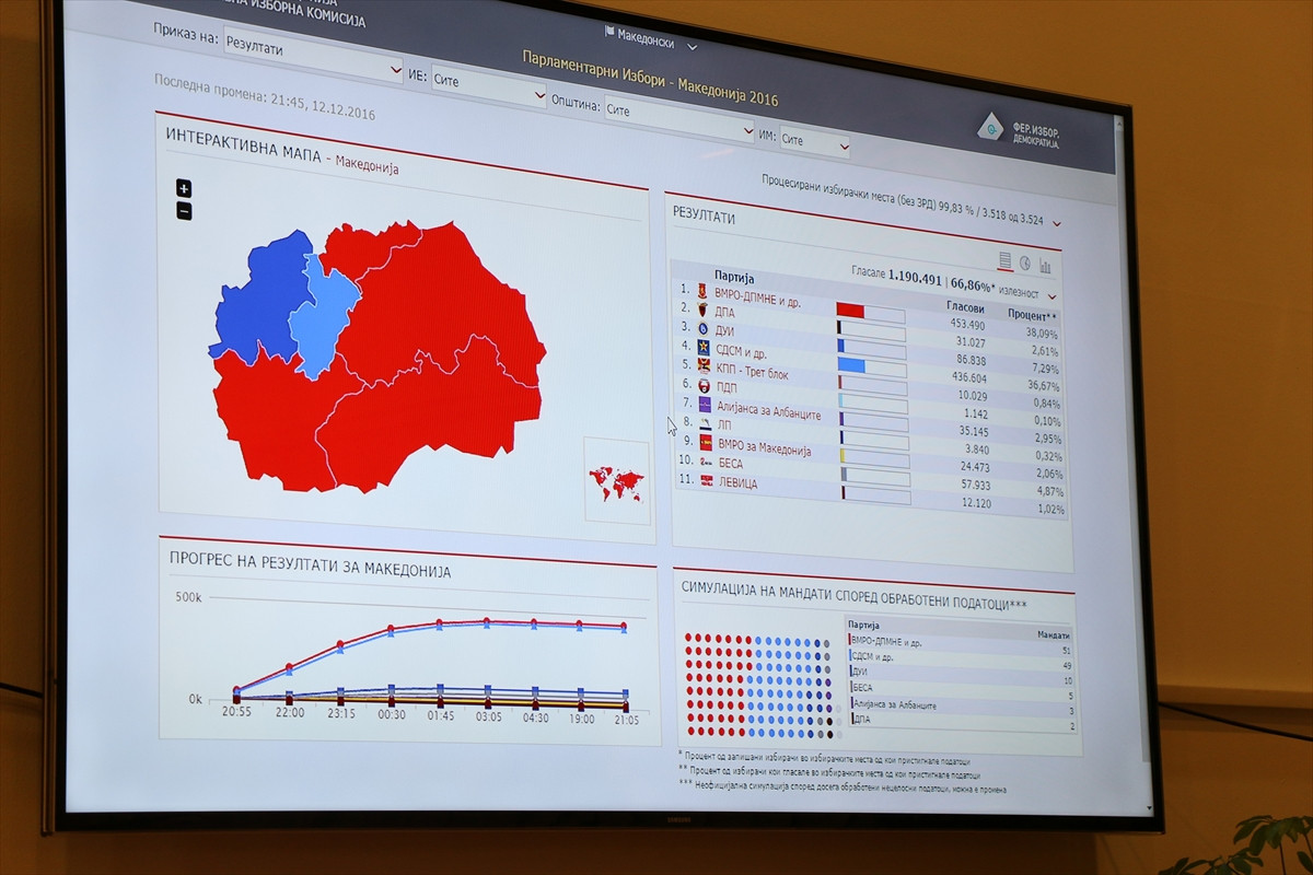 Devlet Seçim Komisyonu (DIK) tarafından yapılan açıklamaya göre, VMRO-DPMNE oyların yüzde 38,09'unu alırken, Makedonya Sosyal Demokratlar Birliği (SDSM) öncülüğündeki ittifak yüzde 36,67, Demokratik Bütünleşme Birliği (BDI) yüzde 7,29, BESA Hareketi yüzde 4,87, Arnavutlar İçin İttifak yüzde 2,95 ve Arnavut Demokratik Partisi (PDSH) yüzde 2,61 oy aldı.
