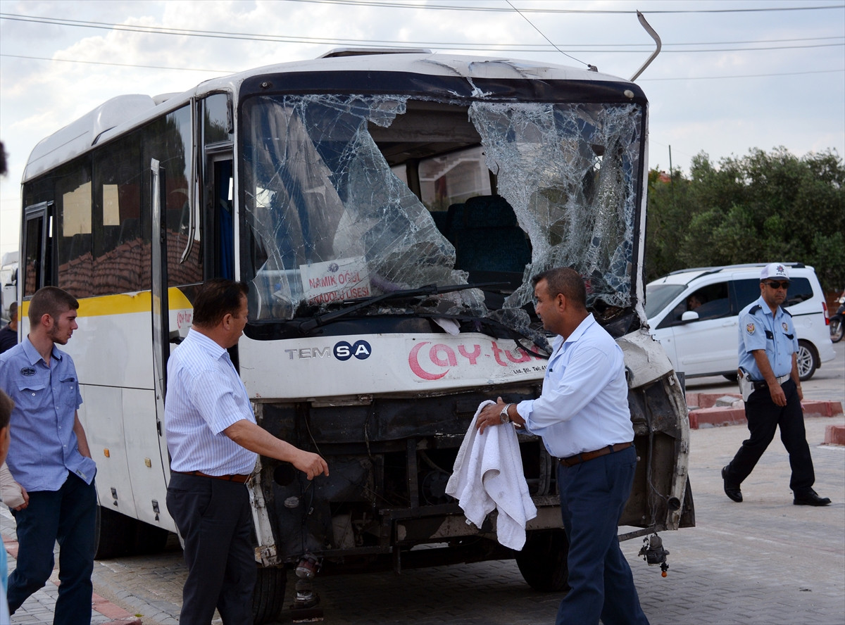 Alınan bilgiye göre, Akhisar Efendi Mahallesi'ndeki tali yoldan çıkan Kenan Kuru yönetimindeki 45 J 4185 plakalı öğrenci servisi, seyir halindeki İsmail Aslan yönetimindeki 45 VN 997 plakalı tırın kasasına çarptı.