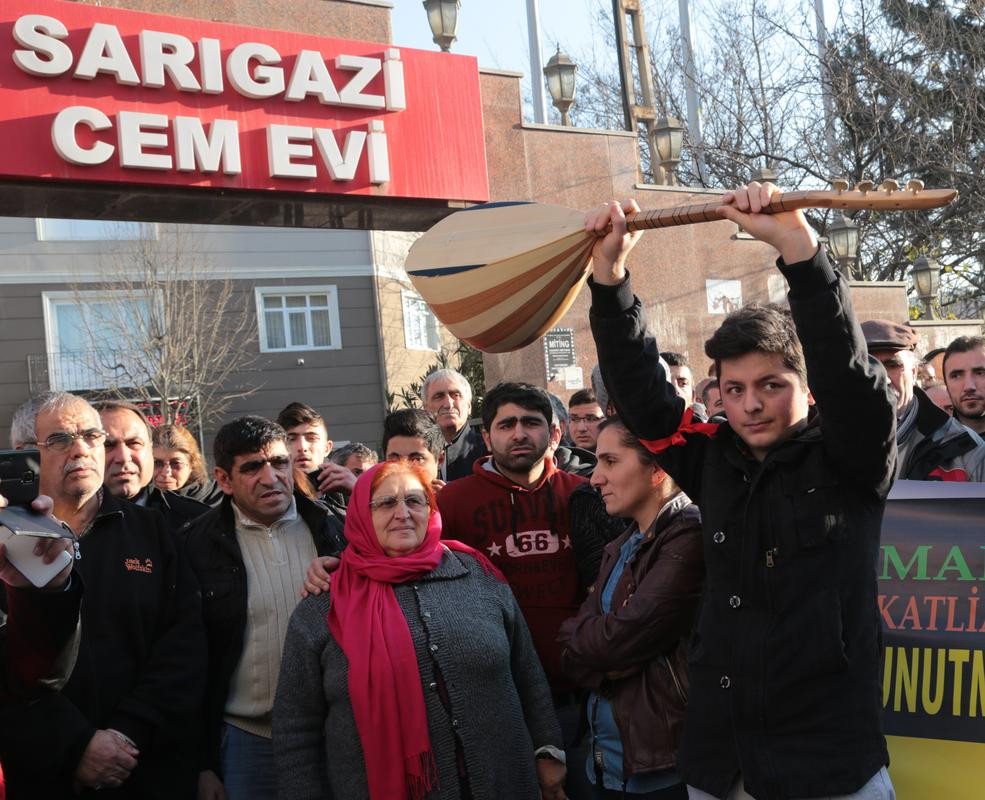 Yenidoğan Cemevi önünde pankart açan bir grup, Sarıgazi Cemevi önüne kadar slogan atarak yürüdü.