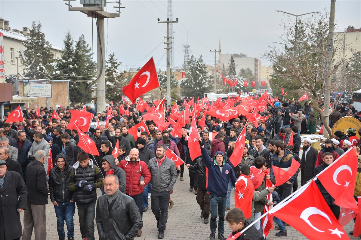 İlçede araçlarla düzenlenen konvoyun ardından Midyat Belediyesi önünde bir araya gelen vatandaşlar, ellerinde Türk bayrakları ile "Vatan sana canım feda", "Kahrolsun PKK", "Şehitler ölmez vatan bölünmez" ve "Türk Kürt kardeştir PKK kalleştir" sloganları attı.