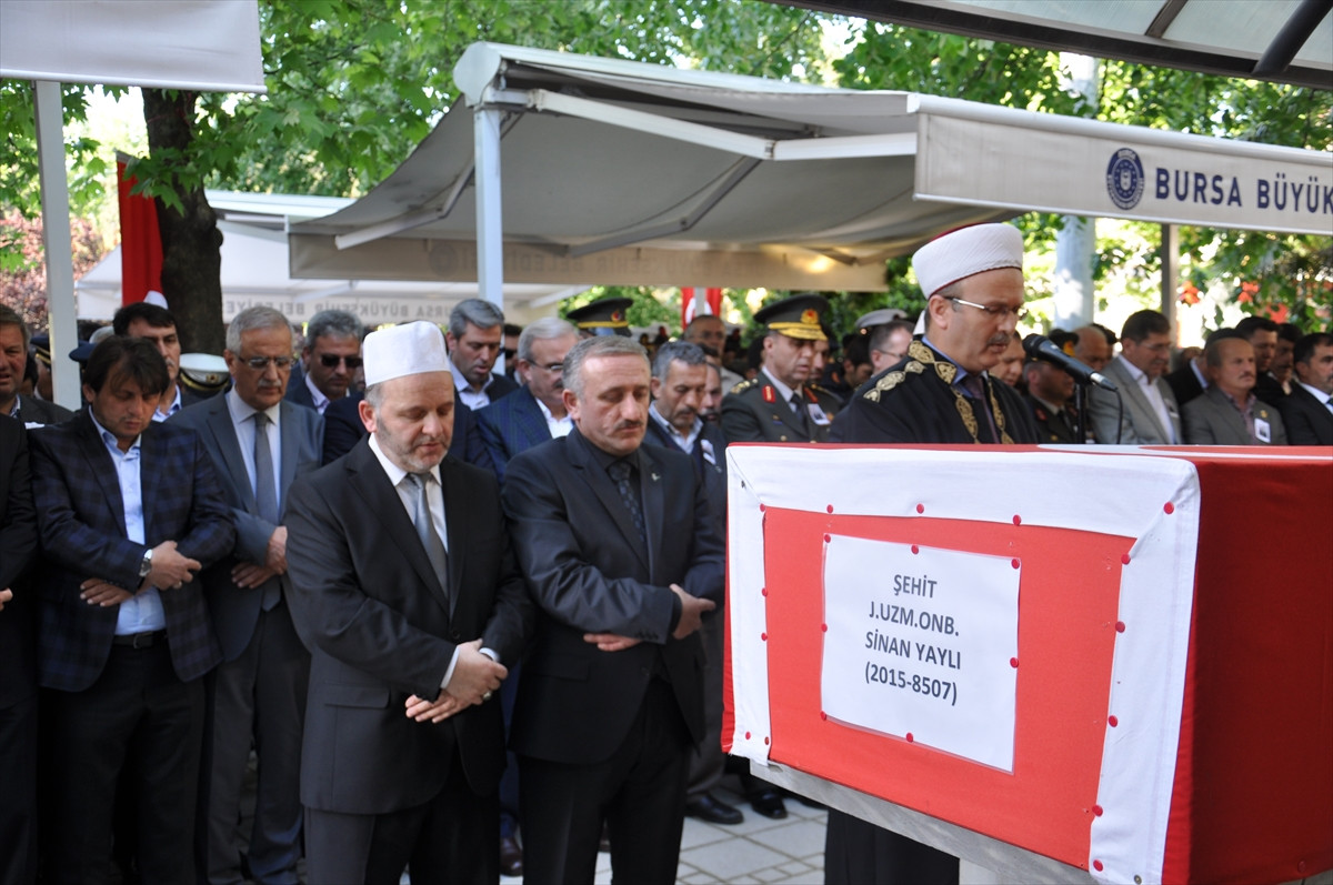 BURSA (AA) - Mardin'in Savur ilçesinde askeri aracın geçişi sırasında teröristler tarafından yola döşenen patlayıcının infilak etmesi sonucu şehit olan Jandarma Uzman Çavuş Sinan Yaylı'nın (24) cenazesi, toprağa verildi.