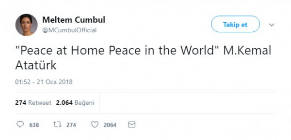 Afrin'i teröristlerden temizlemek için başlatılan Zeytin Dalı Harekatı bazı kesimleri açıkça rahatsız ederken, bunlardan birisi de 'sanatçı' sıfatında olan Meltem Cumbul'dan geldi. Afrin'e düzenlenen teröristlere yönelik operasyonda sosyal meyda birçok insan Mehmetçik'e şans dileyip dualar ederken, Meltem Cumbul attığı tweet ile Atatürk'ün arkasına saklanıp barış istedi.