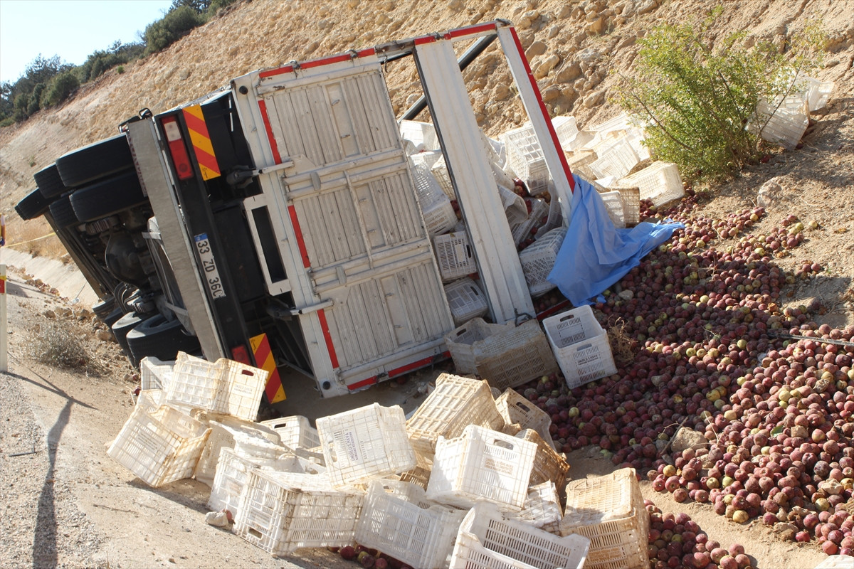 Mut ilçesinde Halim Kalaboyu (42) yönetimindeki 33 ZD 360 plakalı elma yüklü kamyon kontrolden çıkarak devrildi.
