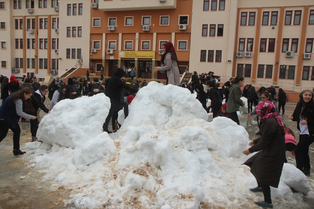 MERSİN (AA) - Mersin'in merkez Toroslar ilçesinde belediye tarafından, kar yağmayan mahallelerdeki öğrencilerin eğlenebilmesi için okullara kamyonlarla kar taşındı.