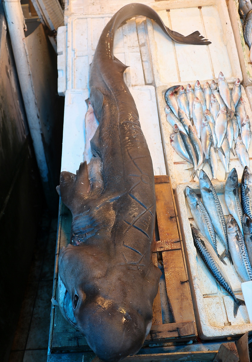Dün akşam denize açılan balıkçıların ağına pamuk cinsi köpek balığı takıldı. Balıkçılar, daha önce Akdeniz'de görmedikleri üzerinde çeşitli şekillerin olduğu balığı teknelerine çıkarıp Mersin'e getirdi. Köpek balığı, Mersin Balık Pazarı'nda sergileniyor.