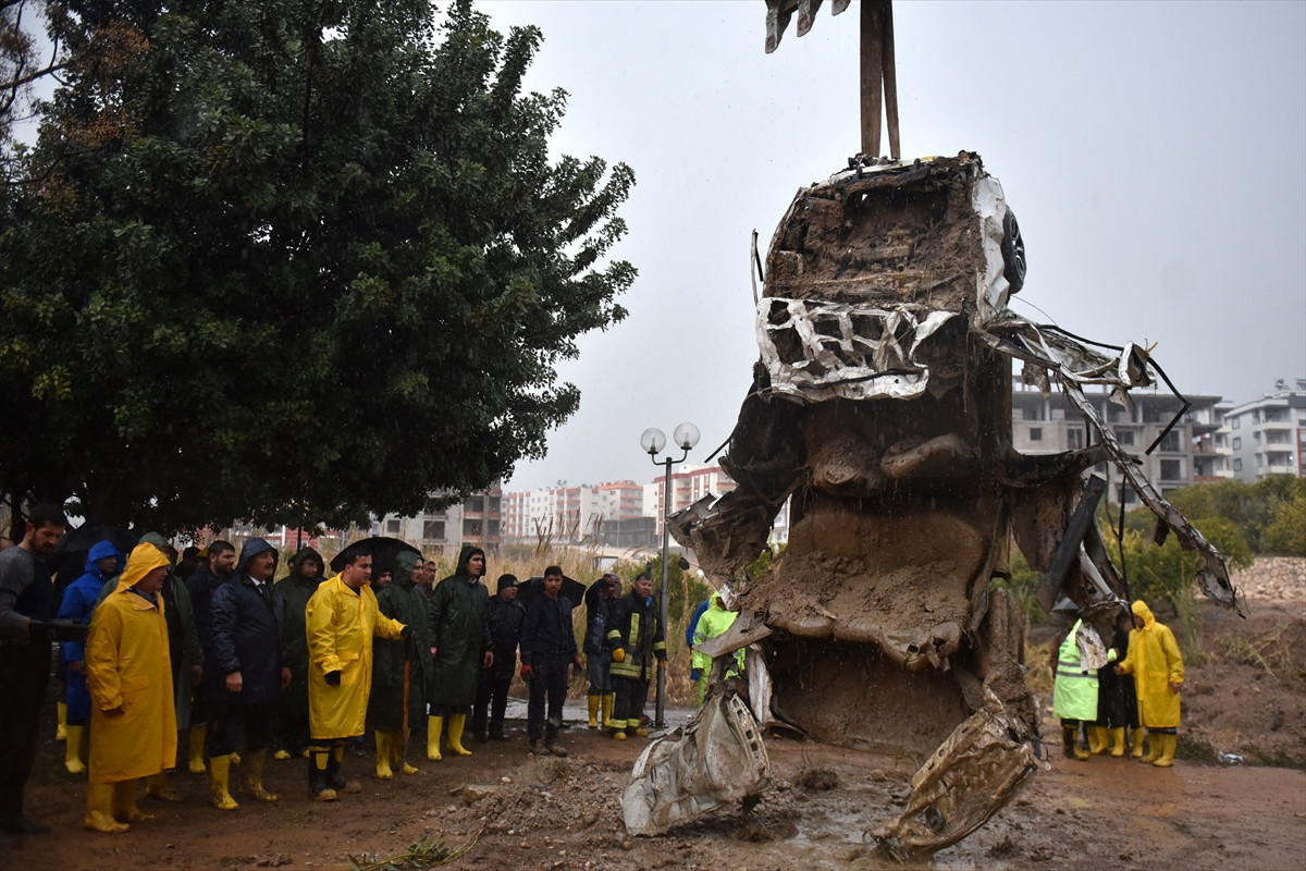 Dere yatağında iş makinelerinin çalışması sırasında çamurun altında tespit edilen hurdaya dönmüş araç, vinç yardımıyla derenin yanındaki bir parka çekildi.