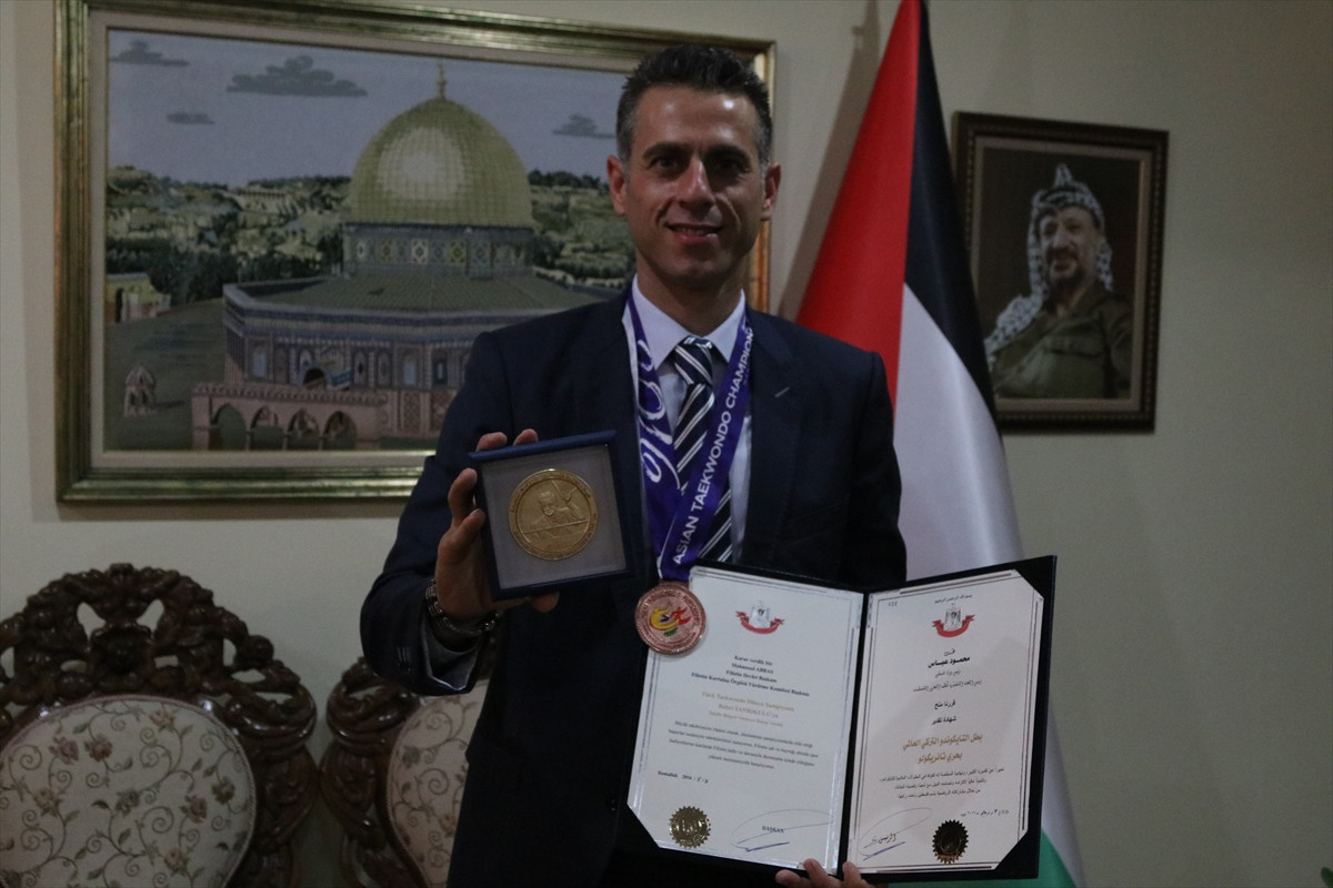 ANKARA (AA) - Filistin'in Ankara Büyükelçisi Faed Mustafa, Asya Kıtası Olimpiyat Elemeleri’nde Filistin’i temsil ederek bronz madalya kazanan tekvandocu Bahri Tanrıkulu’na Filistin Devlet Başkanı Mahmud Abbas’ın gönderdiği altın madalya ve onur belgesini takdim etti.