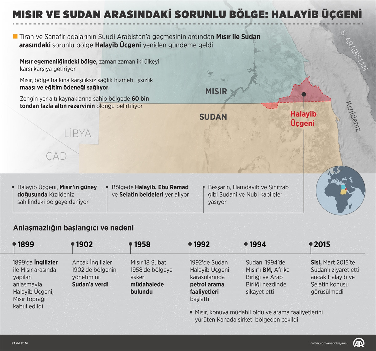 KAHİRE (AA) - Mısır ile Suudi Arabistan arasında imzalanan yeni deniz sınırı anlaşmasıyla Kızıldeniz’deki Tiran ve Sanafir adalarının Suudi Arabistan’a geçmesinin ardından, Mısır ile Sudan arasındaki sorunlu bölge Halayib Üçgeni yeniden gündeme geldi. Sudan Dışişleri Bakanlığı hafta başında yaptığı açıklamada, Halayib sorununun çözümü için Kahire yönetimine "Suudi Arabistan ile Tiran ve Sanafir adaları anlaşmasında olduğu gibi Sudan ile de müzakere masasına oturması ya da uluslararası sözleşmelere ve kanunlara uyulması için uluslararası tahkime başvurulması” çağrısında bulundu. Mısır Dışişleri Bakanlığı Sözcüsü Ahmed Ebu Zeyd ise yaptığı yazılı açıklamada Sudan’ın önerisi reddederken, "Halayib ve Şelatin, Mısır toprağıdır ve Mısır'ın egemenliğindedir. Mısır'ın Sudan Dışişleri'nin açıklamasına yapacağı başka ek bir yorumu yoktur." ifadelerini kullandı. - Halayib ve Şelatin bölgeleri Mısır ile Sudan arasındaki sorunlu bölge, zaman zaman iki ülkeyi siyasi ve askeri olarak karşı karşıya getiriyor. Mısır’ın güney doğusunda yer alan Kızıldeniz sahilindeki bölgeye “Halayib Üçgeni” deniyor. 20,5 kilometrekarelik bölgede Halayib, Ebu Ramad ve Şelatin beldeleri yer alıyor. Siyasi ve idari olarak Mısır egemenliğindeki bölgede Beşşarin, Hamdavib ve Şinitrab gibi farklı Sudani ve Nubi kabileler yaşıyor. Mısır yönetimi bölge sakinlerine elektrik, su ve iskan gibi karşılıksız hizmetler sağlıyor. Bu bölge insanına Mısır’da başka hiçbir vilayette görülmeyen işsizlik maaşı ve öğrencilere eğitim yardımı gibi teşvik edici kolaylıklar sağlanıyor. Ücretsiz sağlık hizmetleri de Mısır’da sadece bu bölgede görülüyor. Söz konusu hizmetler nedeniyle bölge Sudan’dan ciddi göç alıyor. - Anlaşmazlığın başlangıcı ve nedeni Halayib Üçgeni konusunda Sudan ile Mısır arasındaki anlaşmazlığın başlangıcı İngiliz işgali dönemine kadar gidiyor. İngilizler ile Mısır tarafından 1899 yılında yapılan anlaşmayla Halayib Üçgeni, Mısır toprağı kabul edildi. Ancak İngilizler bölgenin Hartum’a Kahire’den daha yakın olduğu gerekçesiyle, 1902 yılında Halayib Üçgeni’nin yönetimini Sudan’a verdi. Sudan’ın bağımsızlığından iki yıl sonra 18 Şubat 1958 tarihinde dönemin Mısır Cumhurbaşkanı Cemal Abdunnasır, askeri bir müdahaleyle bölgede yönetimi ele geçirdi. Mısır ile askeri olarak mücadele edemeyeceğini bilen Sudan yönetimi bu fiili durumu yıllarca kabul etti. Halayib Üçgeni konusunda 1992 yılına kadar iki ülke arasında ciddi bir sorun yaşanmadı. Hartum yönetimi 1992’de Halayib bölgesinin karasularında petrol ve doğalgaz arama faaliyetleri yapması için bir Kanada şirketi ile anlaşma imzaladı. Bunun üzerine Hüsnü Mübarek yönetimi konuya müdahil oldu ve Kanada şirketi bölgeden çekilmek zorunda kaldı. Sudan yönetimi 1994 yılında BM, Afrika ve Arap Birliği nezdinde şikayette bulunarak, Mısır’ın Sudan sınırına 39 hava saldırısı düzenlediğini belirtti. Mısır-Sudan sınır probleminin çözümü için 1995'te Afrika Birliği öncülüğünde Etiyopya’nın başkenti Addis Ababa’da düzenlenen toplantıya Mübarek yönetimi katılmayı reddetti. Mısır yönetimi, dönemin cumhurbaşkanı Mübarek’e Etiyopya’da 1995 yılında düzenlenen suikast girişiminin arkasında Sudan’ın olduğunu iddia ederek, Halayib bölgesinde sınıra askeri müdahalede bulundu ve Sudan askerlerini sınırdan uzaklaştırdı. Mısır’ın Halayib’teki kontrolüne karşı çıkan Beşşarin kabilesi mensubu yerel yönetim başkanı Seyyid Tahir Hesey 2010 yılında öldürüldü. O dönemde Hesey’i Mısır yönetiminin tasfiye ettiği iddiaları gündeme geldi. Mısır medyası Muhammed Mursi döneminde askeri müdahaleye giden yolu hazırlarken Mursi’nin Halayib ve Şelatin’i Sudan’a vereceği iddiasını sıklıkla gündeme getirdi. Mısır Cumhurbaşkanı Abdulfettah es-Sisi, Mart 2015’te Sudan’ı ziyaret etti. Ziyarette Nil Suları ve Etiyopya Rönesans Barajı konuları konuşuldu. Ancak Halayib ve Şelatin dosyaları hassas olduğu gerekçesiyle görüşülmedi. Tiran ve Sanafir adalarının Suudi Arabistan’a geçmesinin ardından Sudan Dışişleri Bakanlığı’nın açıklamasıyla tartışmalı bölge tekrar gündeme geldi. - Bölgedeki maden yatakları Halayib Üçgeni, zengin yer altı kaynaklarıyla dikkati çekiyor. Bölgede altın, uranyum, grafit, krom, nikel, demir cevheri ve barit gibi çok farklı madenlerin bulunduğu biliniyor. El Ahram gazetesinde Haziran 2011'de yayımlanan “Mısır’ın güneydoğusunun kalkınmasında esas unsur Halayib” başlıklı araştırmada özellikle bölgedeki altın rezervine dikkat çekilmişti. Dr. Nasır Abdussettar tarafından kaleme alınan araştırmada, sadece Ulbe Dağı’nda 6 ayrı altın yatağı bulunduğu ve buradaki altın rezervinin 60 bin tondan fazla olduğu belirtilmişti. Mısır Milli Jeoloji Kurumu Başkanı Memduh Abdin ise 2014 yılı Eylül ayında Mısır’da yayın yapan Veto gazetesine yaptığı açıklamada; “Halayib bölgesinde yer alan Havdiyan ve Allaki Vadileri ve Baranis bölgesinde çok zengin altın yatakları olduğunu” ifade etmişti.