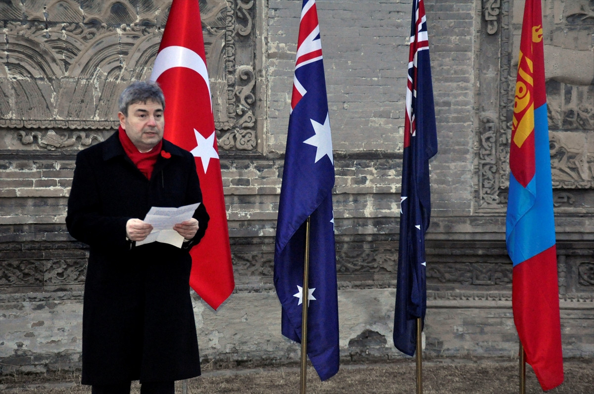 Türk, Avustralya, Yeni Zelanda ve Moğolistan bayrakları önünde bu ülkelerin diplomatları günün önemine ilişkin birer konuşma yaptı.
