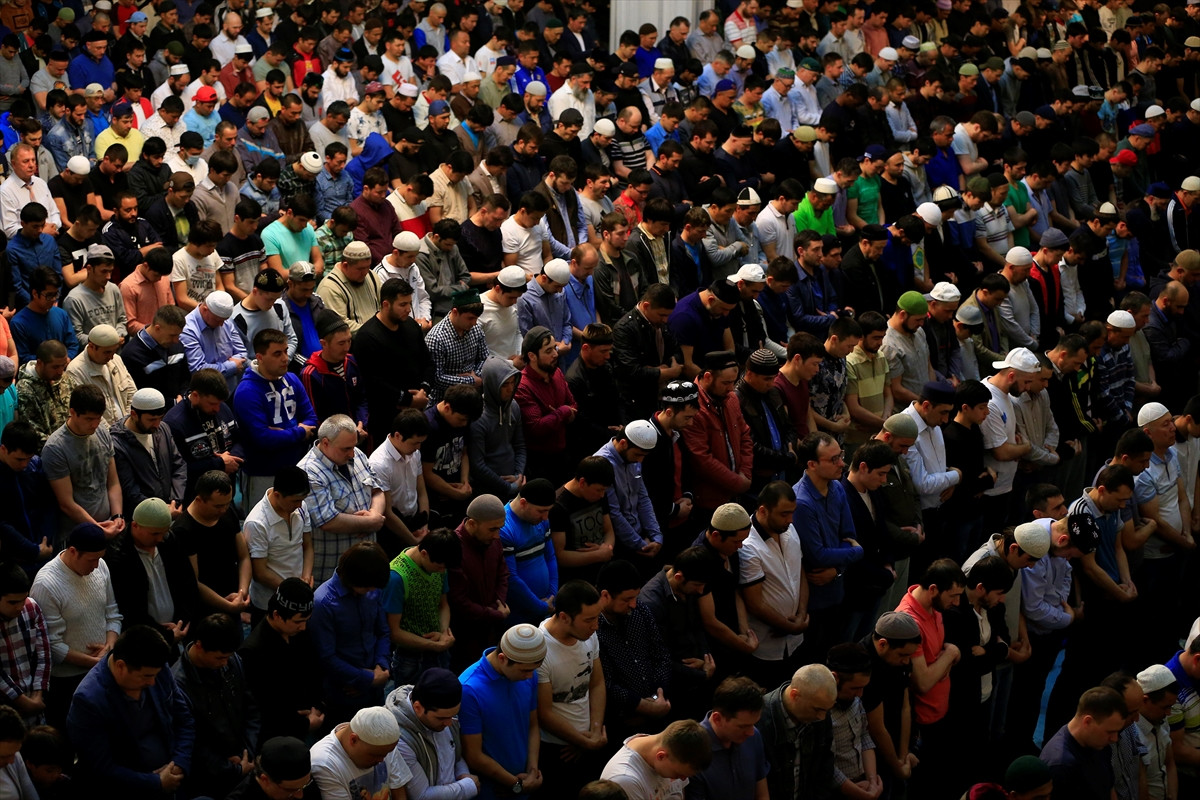 Moskova'da yaşayan Müslümanlar, yatsı namazına doğru Merkez Camisi'ni doldurdu. Cemaat arasında kadınlar ve çocuklar da yer aldı.