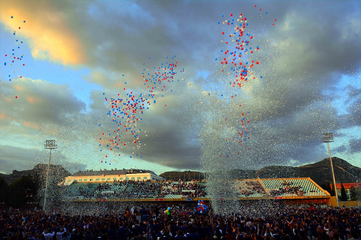 MSKÜ Atatürk Stadyumu'nda düzenlenen, 2015-2016 akademik yılı mezuniyet töreni, öğrencilerin selamlama yürüyüşüyle başladı.