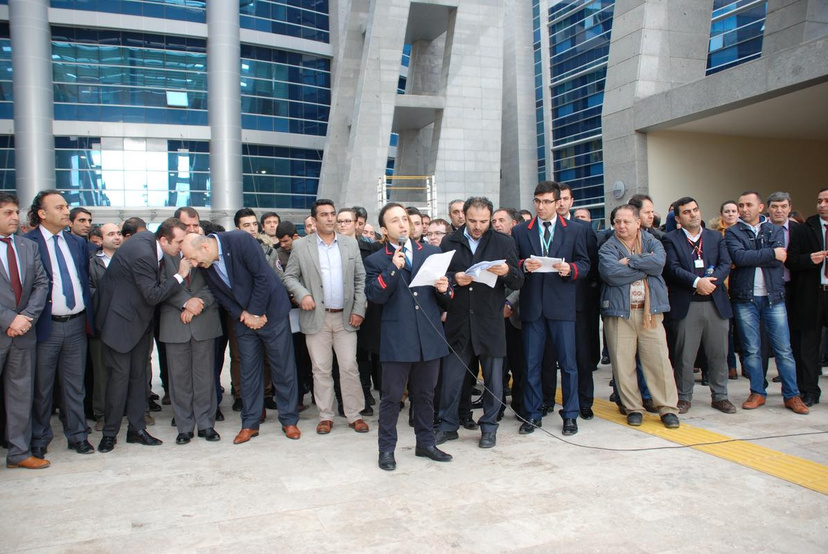 Adalet sarayının C blok girişinde toplanan mübaşirler adına açıklama yapan Mehmet Özger, kadrolarının yardımcı hizmetler sınıfında olduğunu söyledi.