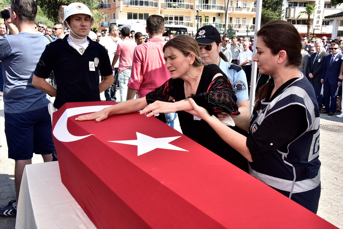 MUĞLA (AA) - Muğla'nın Marmaris ilçesinde, tartıştığı 5 Gürcistanlı tarafından üzerinden araçla geçilerek ezilen ve kaldırıldığı hastanede yaşamını yitiren polis memuru Çetin Şahan için tören düzenlendi.