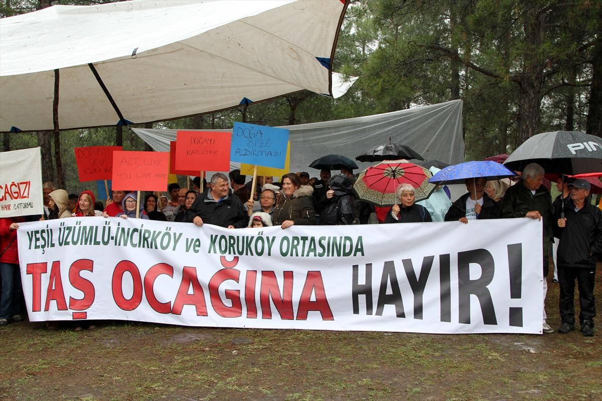Açılması planlanan taş ocağını protesto eden vatandaşlar ellerinde, "Doğayı katletme", "Yaşama hakkımızı taşlama", "Taş ocağına hayır", "Sağlıklı yaşam, hakkımız", "Zeytini bitirince daş yirsiniz gari", "Taş ocağınıza incir ağacı dikeceğiz" yazılı dövizler taşıdı. Eyleme, bölgedeki yerleşik yabancılar da destek verdi.