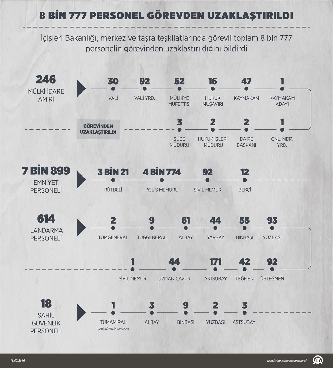 İçişleri Bakanlığından yapılan açıklamada, Bakanlığın merkez ve taşra teşkilatlarında görevli toplam 8 bin 777 personelin görevden uzaklaştırıldığı belirtilmiş, görevden uzaklaştırılanlar arasında, biri il valisi, 29'u merkez valisi olmak üzere, 30 vali, 52 mülkiye müfettişi, 16 hukuk müşaviri, bir genel müdür yardımcısı ve 2 daire başkanı, 3 şube müdürü, 2 hukuk işleri müdürü, 92 vali yardımcısı, 47 kaymakam ve bir kaymakam adayı olmak üzere 246 mülki idare amiri ile 3 bin 21'i rütbeli 4 bin 774 polis memuru, 92'si sivil memur, 12'si bekçi olmak üzere toplam 7 bin 899 emniyet personelinin olduğu bildirilmişti.