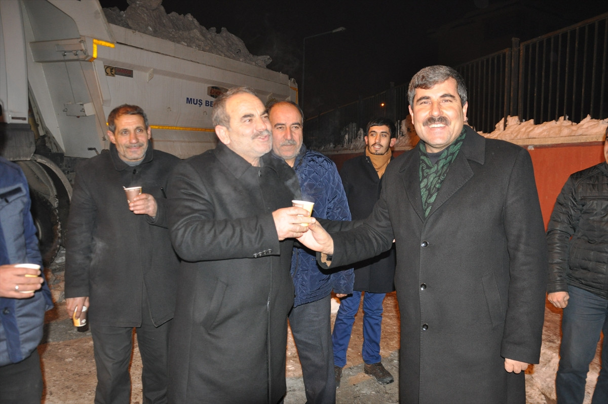 Muş (AA) - Muş Belediye Başkanı Feyat Asya, karla mücadele çalışmalarını yürüten ekipleri ziyaret ederek sıcak süt ve tatlı ikramında bulundu.