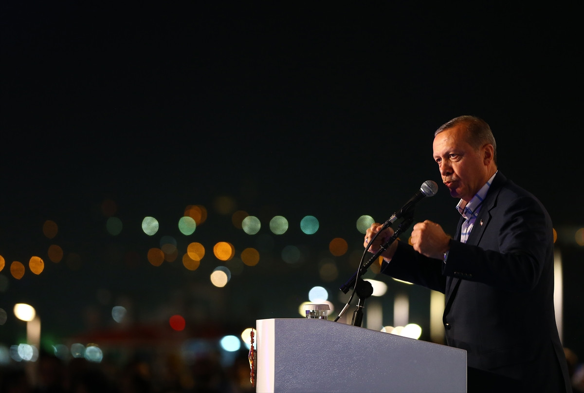 "Son 3 yıldır ülkemizde ardı ardına yaşanan hadiselerin ekonomiyi yorduğunun farkındayız ama küçülttüğünü asla kabul etmiyorum. Gezi olayları, 17-25 Aralık darbe girişimi, bölücü terör örgütünün eylemleri, ardı ardına yaşadığımız iki genel seçim, Suriye'deki gelişmeler, Rusya ile yaşadığımız uçak krizi gibi sorunlar gerçekten yorucuydu. İnşallah artık bu dönemi yavaş yavaş geride bırakacak ve yeni bir heyecanla, yeni bir güçle 2023 hedeflerimize doğru süratle ilerleyeceğiz. Yaşanan bunca hadiseden ders almayan birilerinin hala liseleri, üniversiteleri kaşıyarak, toplumun ulaşabildikleri her kesimini tahrik ederek, yine huzursuzluklar peşinden koştuklarını biliyoruz ama milletimiz artık bunların gerçek yüzünü gördü. Bölücü terör örgütü ve onun siyasi destekçileri, bölgede sokağa çıkamaz hale geldiler. Teröre destek veren kim varsa hepsi de milletimizin tepkisine maruz kalıyor. Bakın şu anda Haliç'in karşısında, Eyüp Sultan Cami ve burada da şu anda Haliç Kongre Merkezindeyiz. Ekranları başında izleyen tüm vatandaşlarıma ve tüm dünyaya sesleniyorum. Terörle mücadelemiz, bu operasyonlarımız, huzur, sükun sağlanmadıkça durmayacaktır. Bunu herkes böyle bilsin. Milletimiz, evlatlarının kanı, canı, fedakarlığı pahasına elde ettiği huzur ve güven ortamını, üç beş çapulcunun heba etmesine izin vermeyecektir. Birileri çakallara meydan okuyor. Buyursun çakallara meydan okuyanlar, hamdolsun bizim şehirlerimizde çakallar yok. Dağlara çıksınlar, orada çakalları kovalasınlar. Onların yeri orası. Türkiye'nin artık yeni Gezilere, yeni Paralel Yapılara, yeni kalkışmalara değil, istikrar içinde büyümeye, üretmeye, kalkınmaya ihtiyacı var. Çevremizde sırtlanlar, üzerimizde akbabalar dolaşırken, biz kendi aramızda kavgaya tutuşamayız. Gün birlik günüdür, gün güçlü olma günüdür, gün mücadele günüdür. Onun için bir olacağız, beraber olacağız, iri olacağız, diri olacağız, kardeş olacağız, hep beraber Türkiye olacağız."
