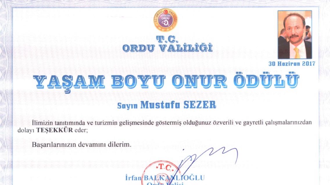 Törende bir konuşma yapan Ordu Valisi irfan Balkanlıoğlu, "Mustafa Sezer, Ordu'da ve Karadeniz'de çok büyük işler başardı. Ordu'da devrim yaptı ve Ordu'yu ve Karadeniz'i Şah'a kaldırdı. Yaptığı projelerle Ordu'yu dünyaya tanıttı binlerce turist, milyonlarca dolar getirdi. Mustafa Sezer'e yaptığı sıradışı çalışmalardan dolayı biz de sıradışı bir ödül vererek taltif ettik. Bundan sonraki yaşamında da başarılar dileriz" dedi.