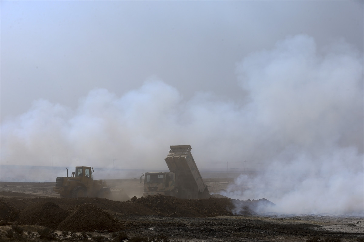 MUSUL (AA) - Irak'ta terör örgütü DEAŞ'ın elinde tuttuğu Musul kentinin güneyinde militanlar tarafından ateşe verilen Mişrak Kükürt Tesisi, 8 gündür söndürülmeye çalışılıyor. Yanan ham kükürtün havaya saçtığı zehirli duman bölgede görev yapan askerler ile köy sakinlerini ciddi bir şekilde tehdit ediyor.