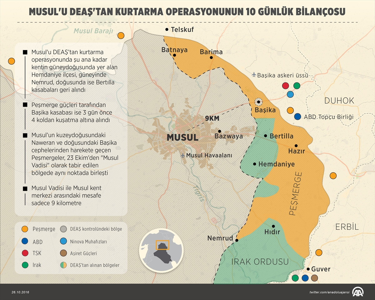 Terör örgütü DEAŞ'ın iki buçuk yıldan uzun bir süredir elinde tuttuğu Musul kentine en çok yaklaşan güçler Peşmergeler oldu. Kentin kuzeydoğusundaki Naweran ve doğusundaki Başika cephelerinden hareket geçen güçler, 23 Ekim tarihinde "Musul Vadisi" olarak tabir edilen bölgede bileşti. Söz konusu güçlerin birleştiği nokta ile Musul kent merkezi arasındaki mesafe sadece 9 kilometre.