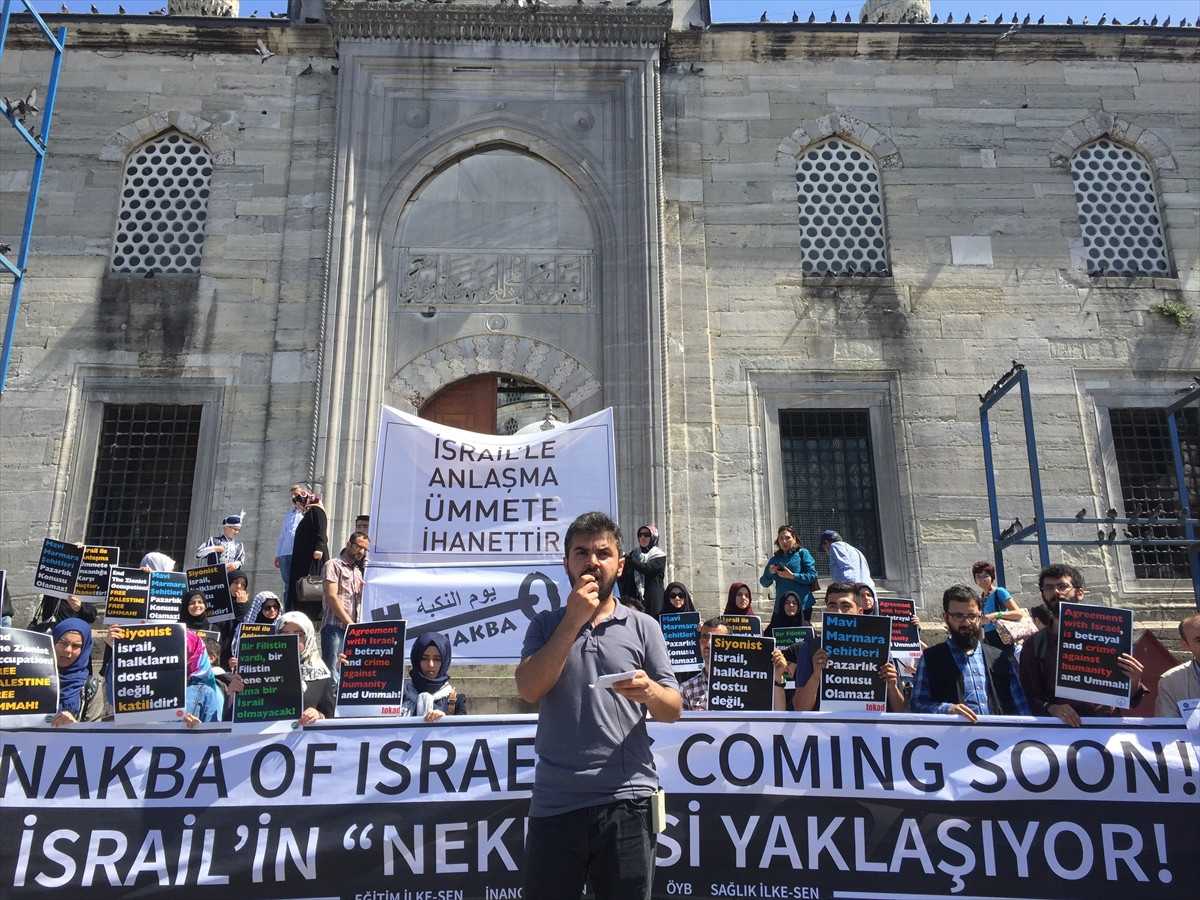 Eminönü Meydanındaki Yeni Camii önünde toplanan Eğitim İlke-Sen, İnanç İlke-Sen, Sağlık İlke-Sen ve Özgür Yazarlar Birliği üyeleri, "İsrail'in 'Nekbe'si yaklaşıyor", "Nekbe 1948" ve "İsrail'le anlaşma ümmete ihanettir" yazılı pankartlar açıp İsrail aleyhine çeşitli sloganlar attı.