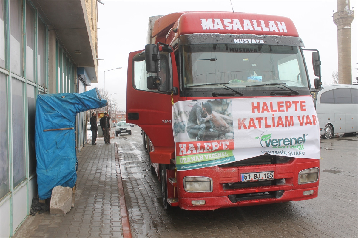 NEVŞEHİR (AA) - Verenel Derneği tarafından, "Halep'e uzanan el" sloganıyla başlatılan yardım kampanyası çerçevesinde Nevşehir'in Derinkuyu ilçesinde toplanan temel ihtiyaç malzemelerini taşıyan yardım tırı yola çıktı.
