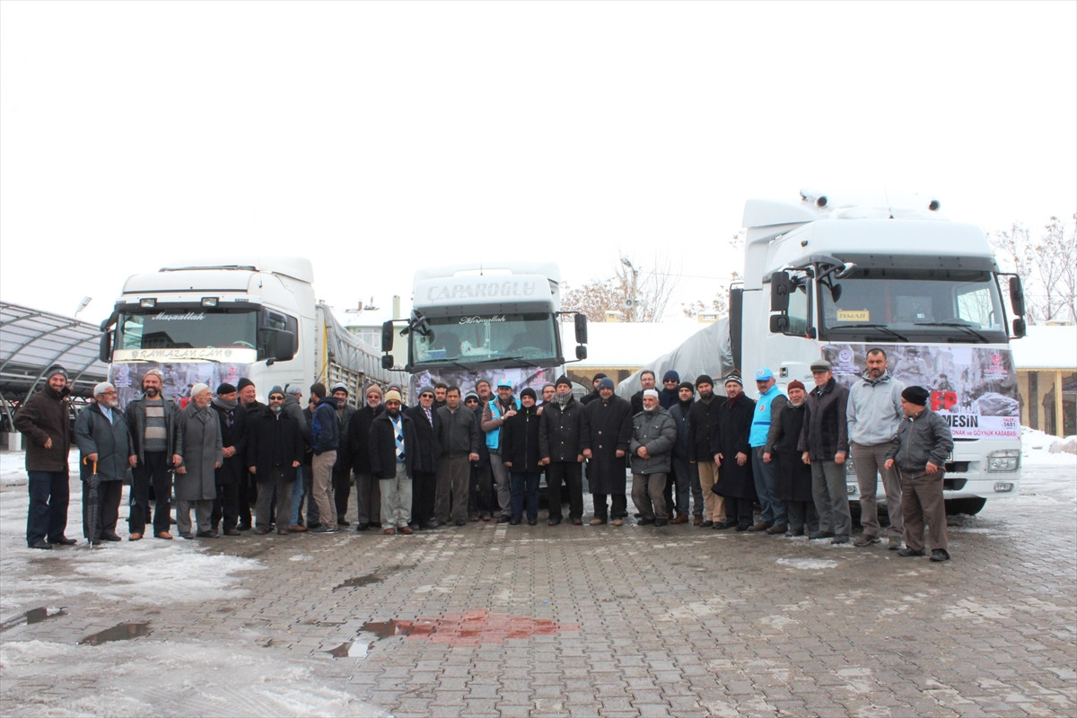 Konuşmanın ardından, yardım malzemeleri bulunan 6 tır dualarla uğurlandı.