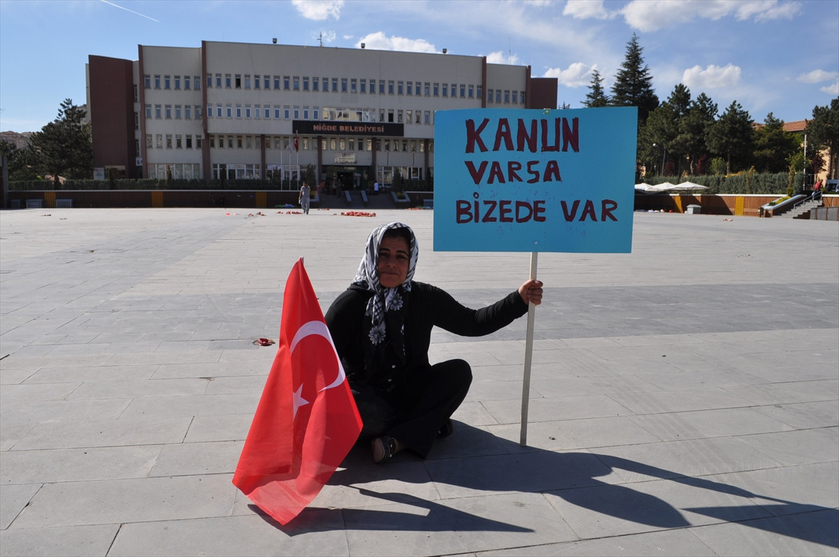 Niğde'de çalıştığı bir tekstil fabrikasından eşi ve oğluyla işten çıkarılan Aynur Kirman, Kent Meydanı'nda yaptığı oturma eylemiyle, işvereni protesto etti. Elinde Türk bayrağı ve "Kanun varsa bize de var" yazılı pankart taşıyan 38 yaşındaki Kirman, Kent Meydanı'nda gazetecilere yaptığı açıklamada, işverenin bir sendika hakkında suç duyurusunda bulunmasını istediğini, bunu reddettiği için eşi Kazım ve oğlu Ferhat Kirman ile işten çıkarıldığını iddia etti. Yaklaşık 2 aydır maaş alamadığını, işten çıkış dilekçesini götürdüğü işvereni tarafından darbedildiğini ve hakaretlere maruz kaldığını öne süren Kirman, "Suç duyurusunda bulundum, 7 gün darp raporu aldım." dedi. Kendisiyle beraber 37 kişinin daha işine son verildiğini belirten 4 çocuk annesi Kirman, diğer işçilerin tazminatlarını alamama korkusu, eşi Kazım ve oğlu Ferhat'ın ise iş görüşmeleri nedeniyle, eyleme katılamadığını kaydetti. Kirman, "Eylemi tek başıma yapıyorum. İşten çıkarıldıktan sonra diğer fabrikalara gittim, kimse beni işe almadı. Fabrika sahibi ve müdürü, diğer fabrikalara ismimizin olduğu bir liste göndermiş. 'Eğer sendikayı şikayet etmezseniz, teker teker çıkışlarınızı vereceğiz' dediler. Kadına şiddet diye bir şey vardı, hani o nerede kaldı? İşveren tarafından darbedildim. Pazartesi gününden sonra çocuklarımı da alıp geleceğim ve burada açlık grevi yapacağım." diye konuştu. Açıklamasının ardından, bir süre oturma eylemi gerçekleştiren Kirman, daha sonra eylemini sonlandırdı.